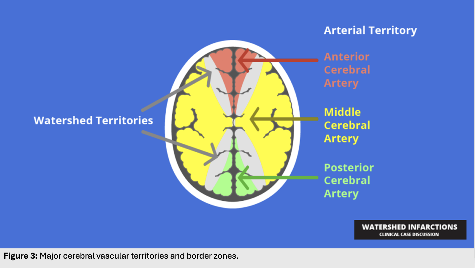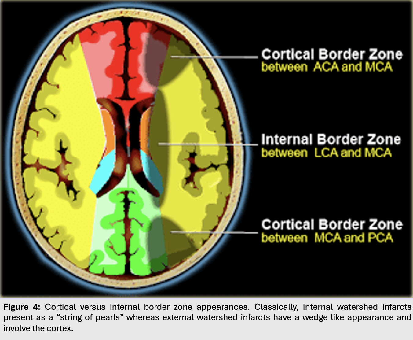 - In these scenarios, the first areas of the brain to suffer from ischemia will be those furthest away from major arteries.